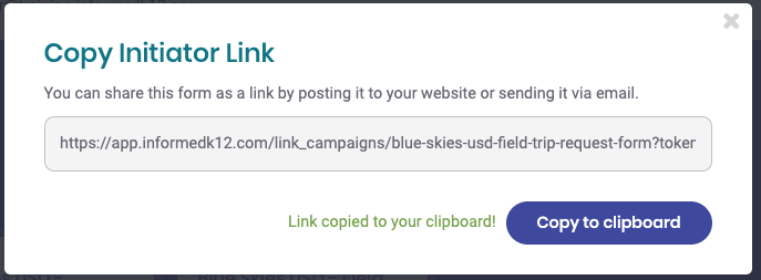 You can then share the link through the appropriate channels as needed. For your district's IK12 public directory (via the "Initiate" option at the top of your Manage Folders page) contact your district's Form Admin. For sharing the link on your district website, you'll want to contact your district's IT department to post it where applicable. You can also email the link out to your staff as needed.