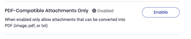 You can limit users to only attach files that will convert to a PDF. Supported file types include images, PDFs, and text files.