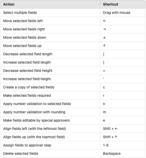 When setting up or editing your form in the Document Editor, you may need to update multiple fields simultaneously. By using Hot Keys, you can quickly select multiple fields and make bulk edits such as resizing, aligning, copying, and assigning fields to specific steps in your workflow. Below, you’ll find instructions and a directory of the different shortcut options.