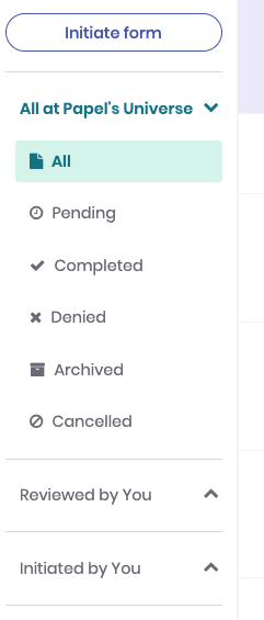 At the very top, you can initiate a new form or copy the initiate link to share with others. Under that, you can narrow submissions to the following categories: