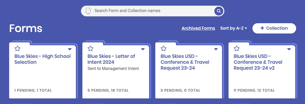 When you log in to your account, you will be taken to your Manage forms page. There, you will see folders for all the forms you have initiated, reviewed, have been given access to manage/track, as well as any forms you own.