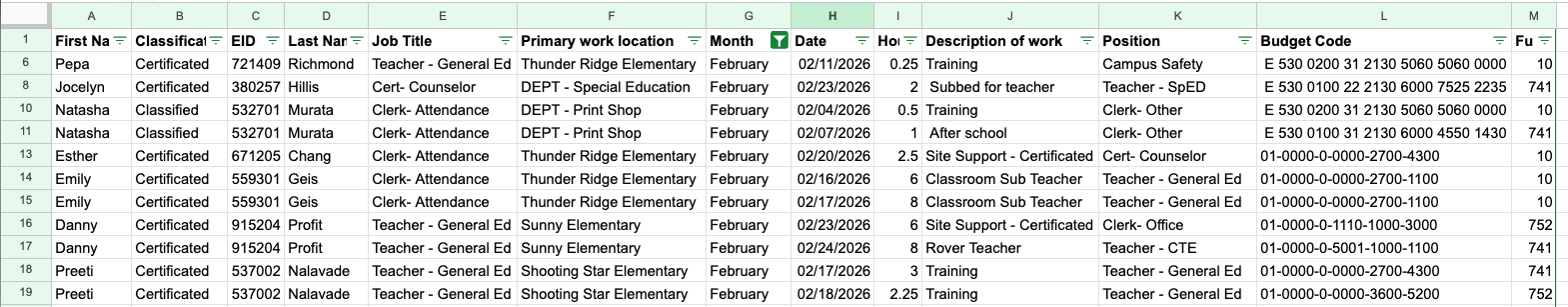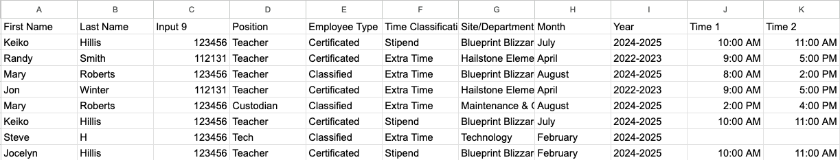 Exports include both the table rows and any additional fields you choose to include for context (such as employee name, ID, approver, etc.).