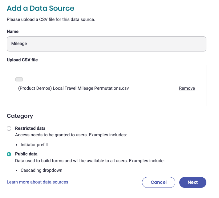 A Data Source is a reusable table of information that can be referenced across multiple forms and workflows.